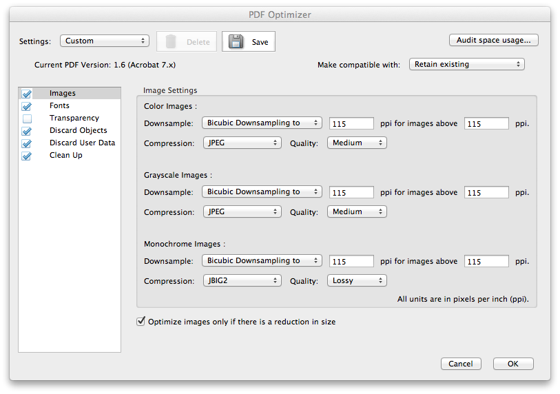Use the Adobe Acrobat PDF Optimizer to reduce the file size of PDF files